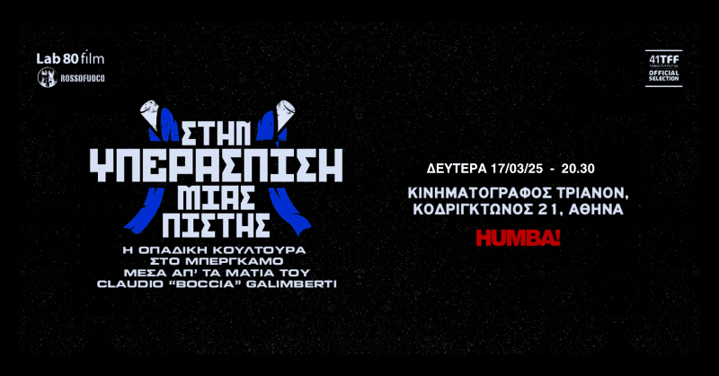 Το περιοδικό HUMBA! σας προσκαλεί εκ νέου στον κινηματογράφο ΤΡΙΑΝΟΝ για την 5η και τελευταία (μέχρι νεοτέρας) προβολή (17/5, 20:30) του ντοκιμαντέρ «Στην Υπεράσπιση μιας Πίστης-Η οπαδική κουλτούρα στο Μπέργκαμο μέσα από τα μάτια του Claudio «Bocia» Galimberti.
