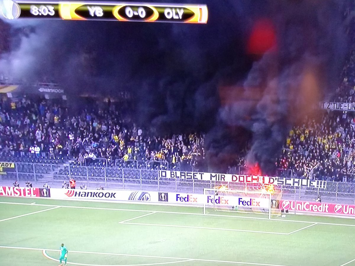 Μόλις 8 λεπτά μετά την σέντρα στο παιχνίδι της Γιούνγκ Μπόις με τον Ολυμπιακό, υπήρξε διακοπή λόγω φωτιάς. Συγκεκριμένα, πίσω από το τέρμα που έκαναν επίθεση οι «ερυθρόλευκοι» στο πρώτο μέρος, έπιασε φωτιά, η οποία είχε σαν αποτέλεσμα ο διαιτητής να διακόψει για λίγα λεπτά το ματς, καθώς ο μαύρος καπνός ήταν πολύ έντονος.