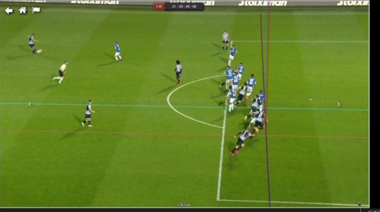 Η μπλε και κόκκινη γραμμή είναι οι κάθετες σε 3D ενώ η γραμμή οφσάιντ είναι η μωβ (δηλαδή είναι στην ίδια ευθεία οι παίκτες). Ίσως να μπορούσαν να τραβήξουν τη μπλε γραμμή πιο αριστερά γιατί τη βλέπω να περνάει από τον αγκώνα αντί του ώμου.