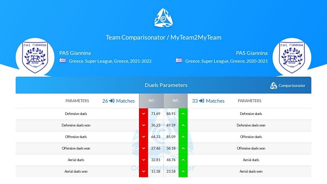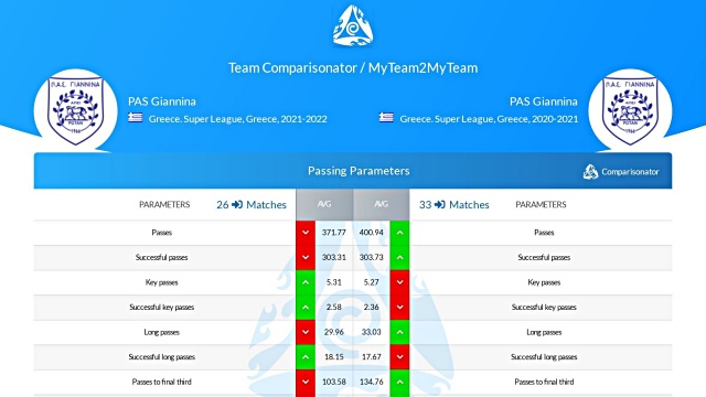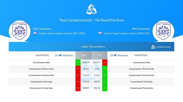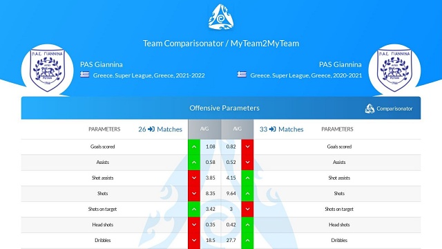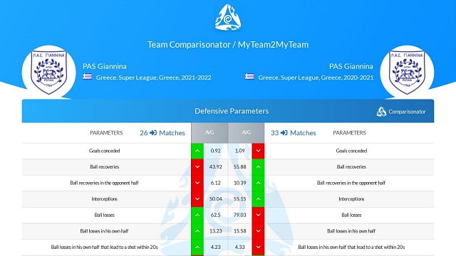 Η φετινή είναι μια ομάδα που σκοράρει περισσότερο (1.08 ανά ματς) από την περσινή (0.82), μολονότι δεν δημιουργεί περισσότερες κλασικές ευκαιρίες (xG: 1.15) από την περσινή (1.18). και δεν σουτάρει περισσότερο (8.3 - 9.6). Φέτος συμβαίνει να βρίσκει συχνότερα εστία Η ομάδα του Μεταξά δέχεται λιγότερα γκολ (0.92 ανά ματς) από εκείνη του Γιαννίκη (1.09), και αυτό το καταφέρνει επιτρέποντας πάνω κάτω το ίδιο μεγάλες ευκαιρίες στον αντίπαλο (xShot against: 1.23 - 1.28). Η φετινή ομάδα κρατά λιγότερο την μπάλα και έχει περίπου ίδια ακρίβεια στις μεταβιβάσεις με πέρσι, με παρόμοιες επιδόσεις στις παραμέτρους ποιότητας της κατοχής της μπάλας. Η φετινή ομάδα “χάνει” από την περσινή σε όλες τις παραμέτρους των επιθετικών και αμυντικών μονομαχιών. Η αποτελεσματικότητά της βασίστηκε πολύ περισσότερο στην τοποθέτησή της σε άμυνα και επίθεση και όχι στην ένταση που είχε στις μονομαχίες.