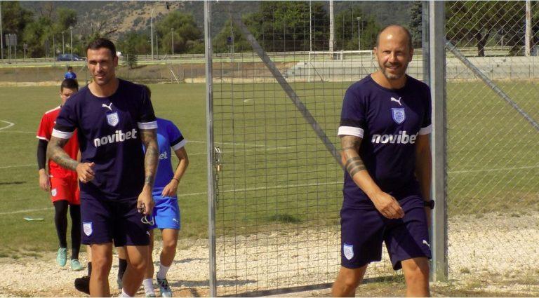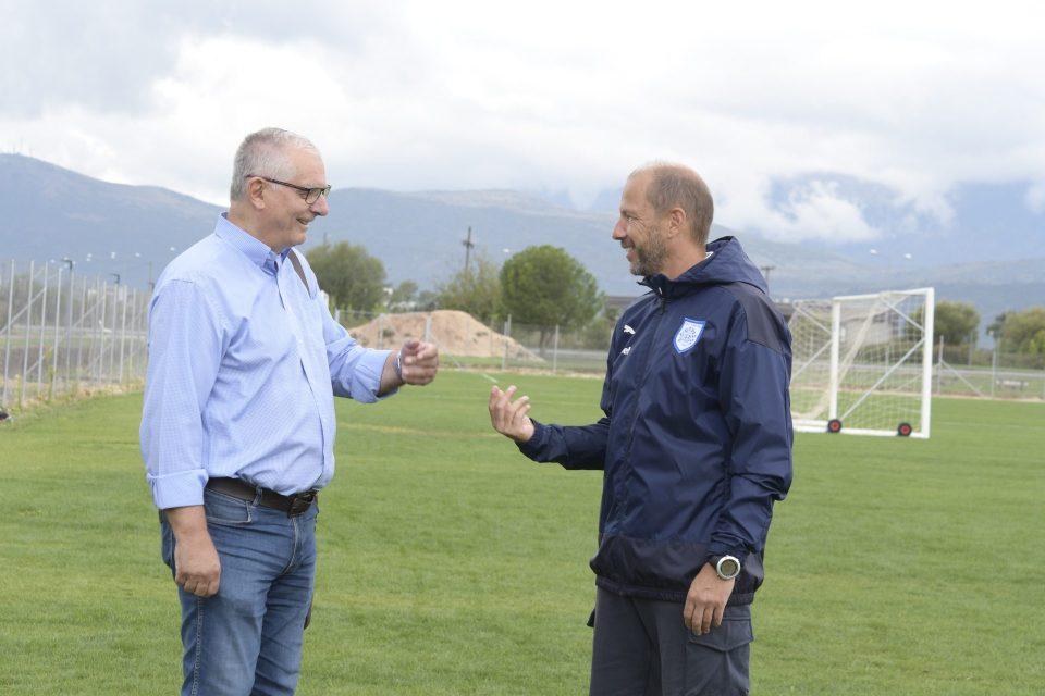 Δεξιά ο Ρενέ Πομς τα λέει με τον Βαγγέλη Γυφτόπουλο στο βοηθητικό γήπεδο του ΠΑΣ